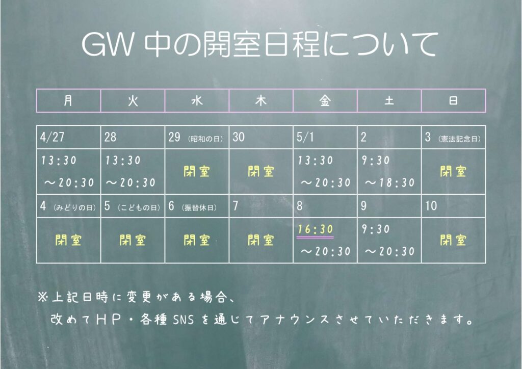 当教室のGW期間中の開室予定ですが、添付した画像のとおりとなっています。