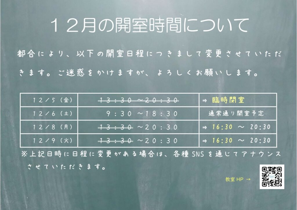 12/5(金)・8(月)・9(火)の開室時間について
